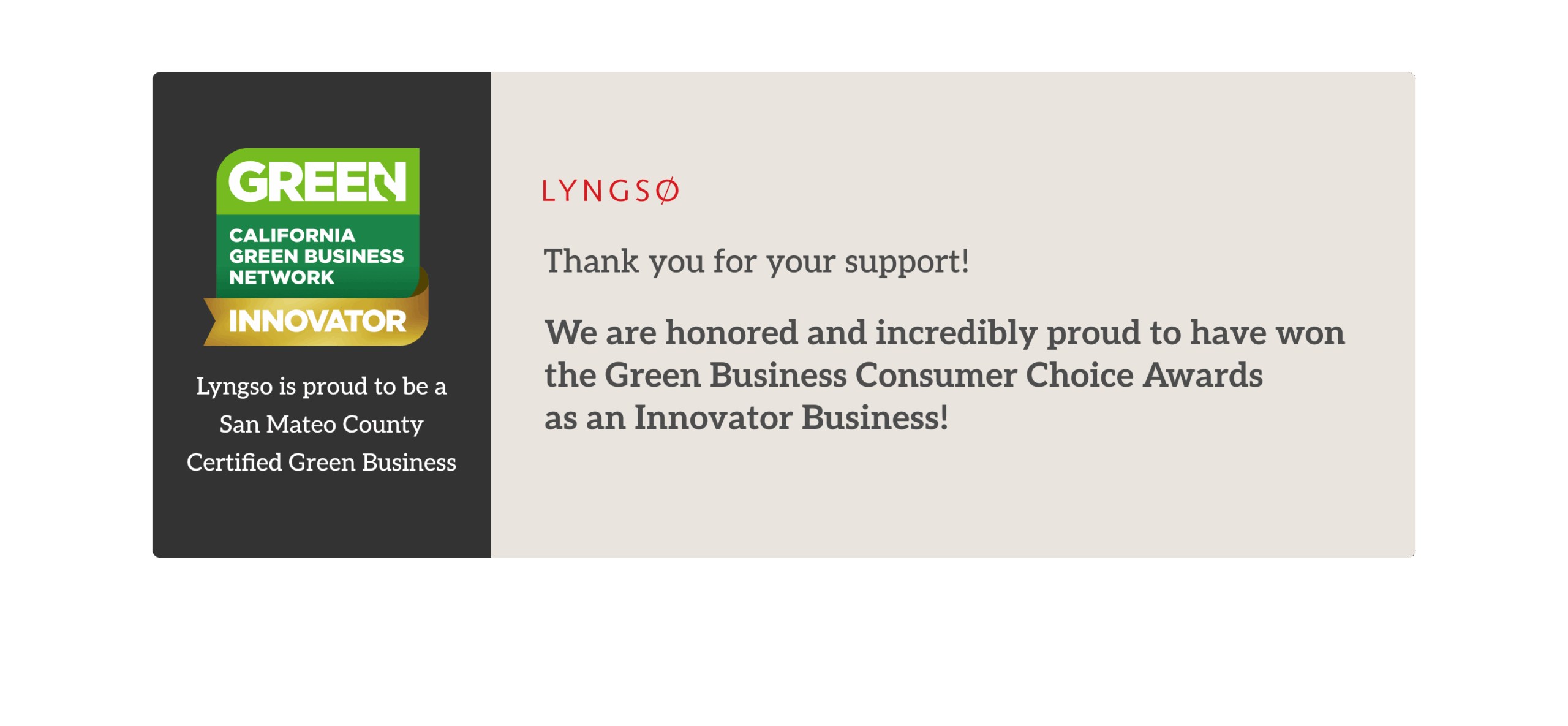 We’re proud to be recognized as a San Mateo County Certified Green Business – and now we’re in the running for the first ever Green Business Consumer Choice Awards – Innovator Business category!